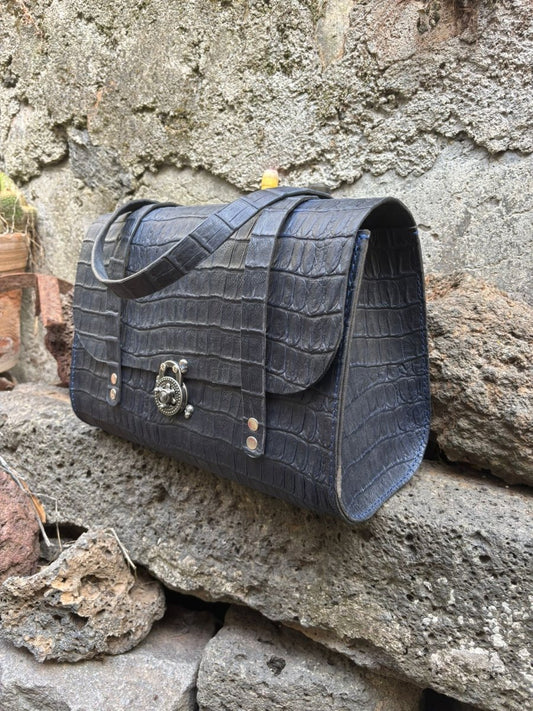 Borsa Matilde in Pelle di Bovino con Stampa Cocco Blu – Inserti in Ottone e Chiusura Medievale